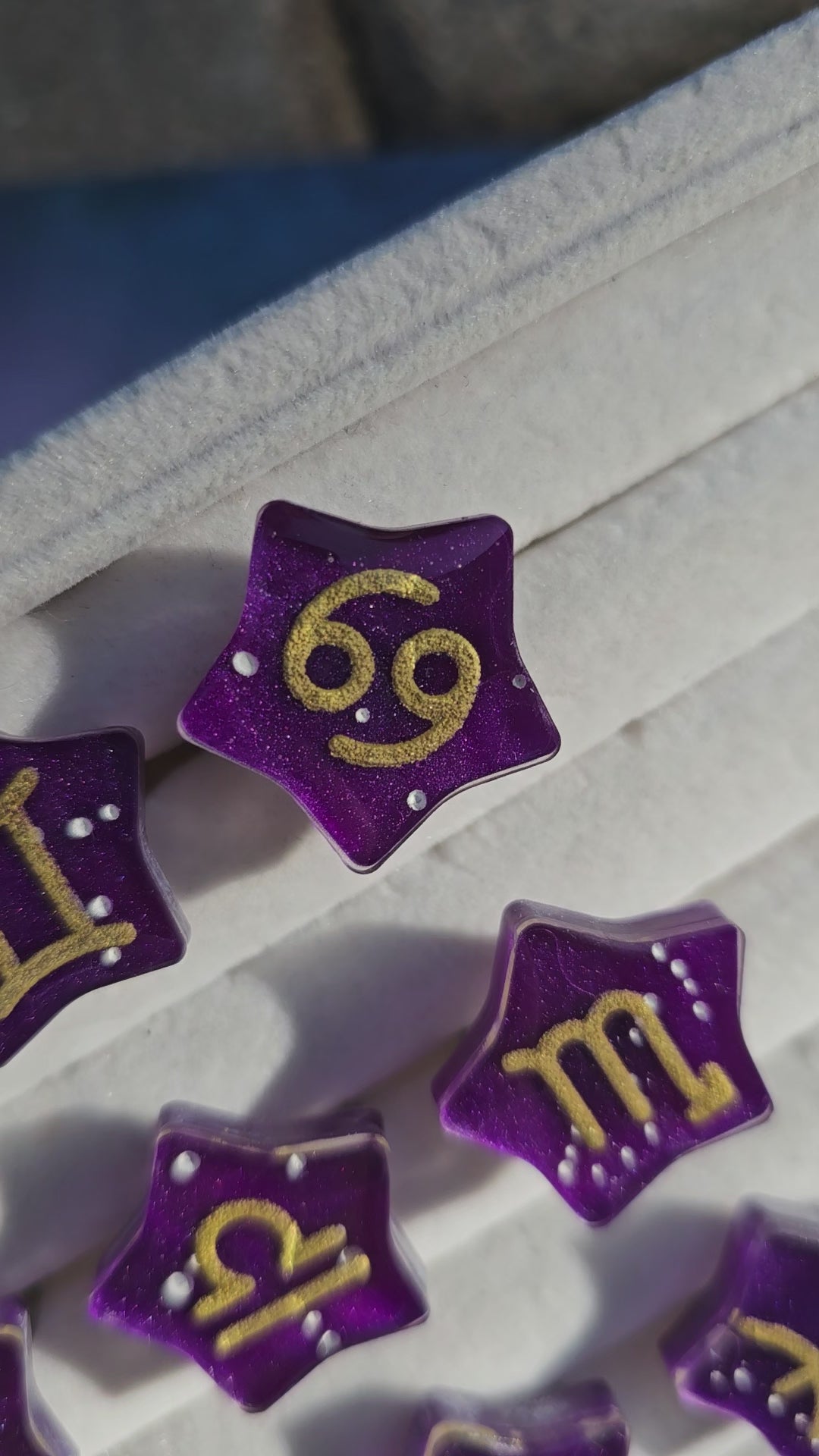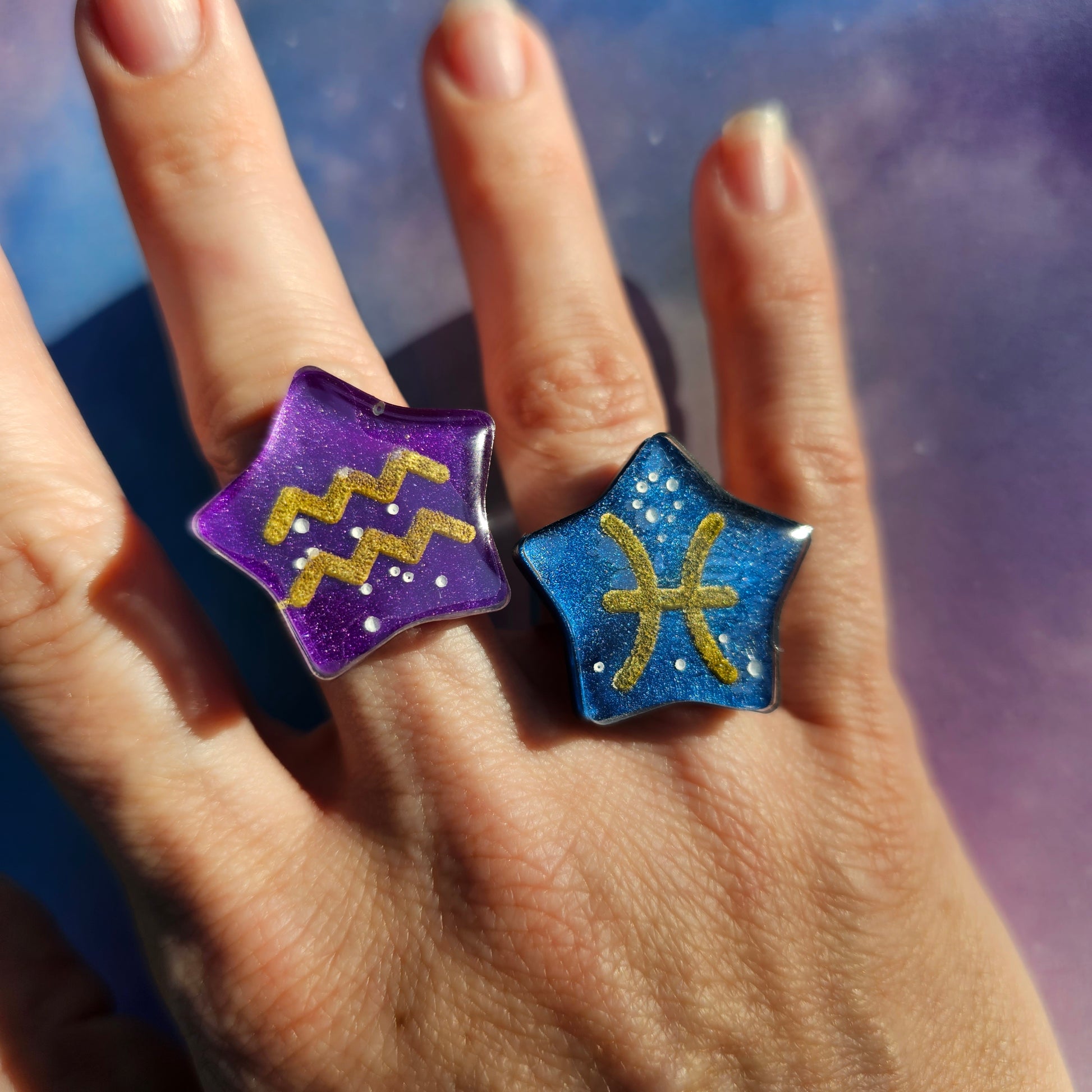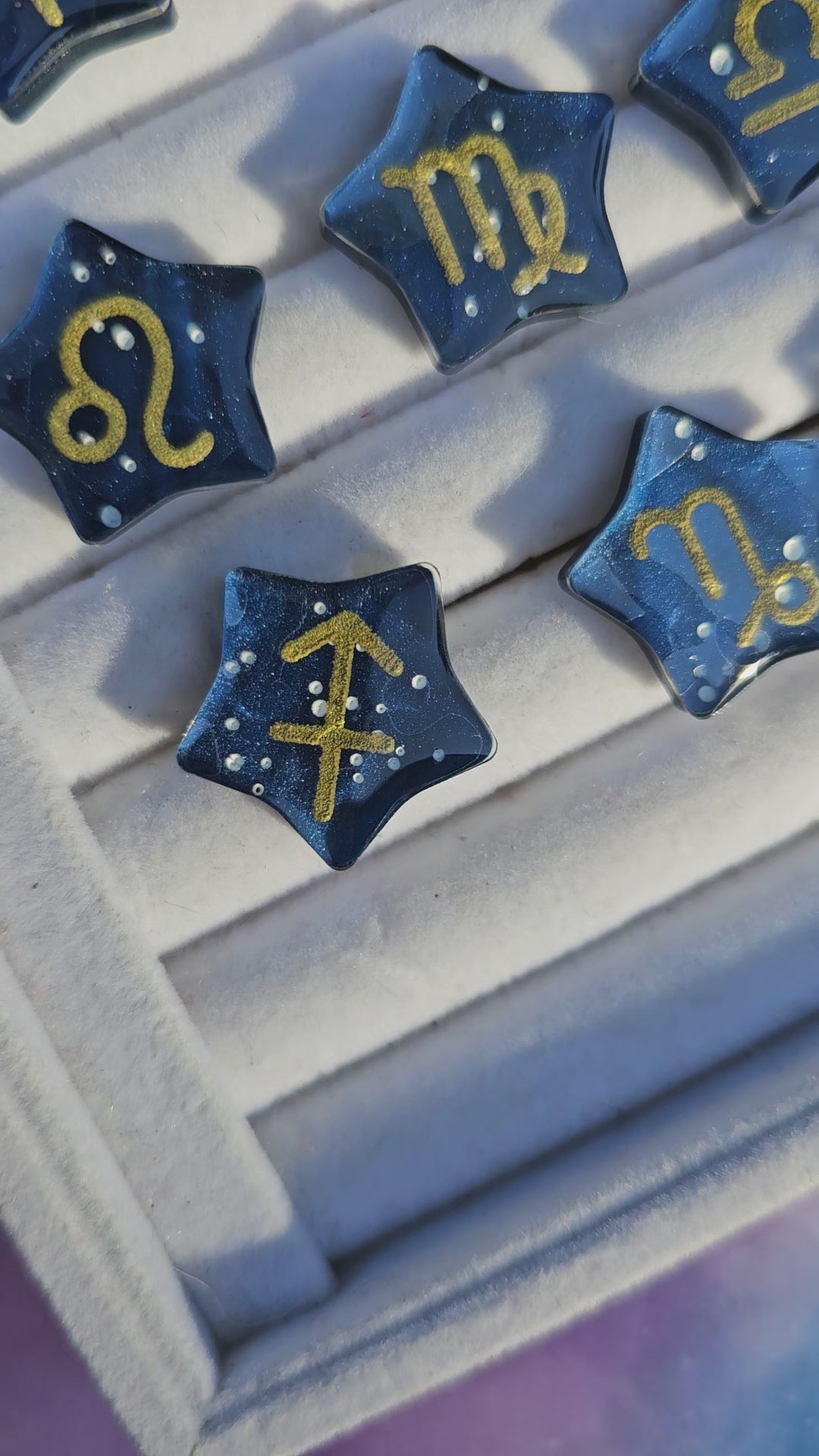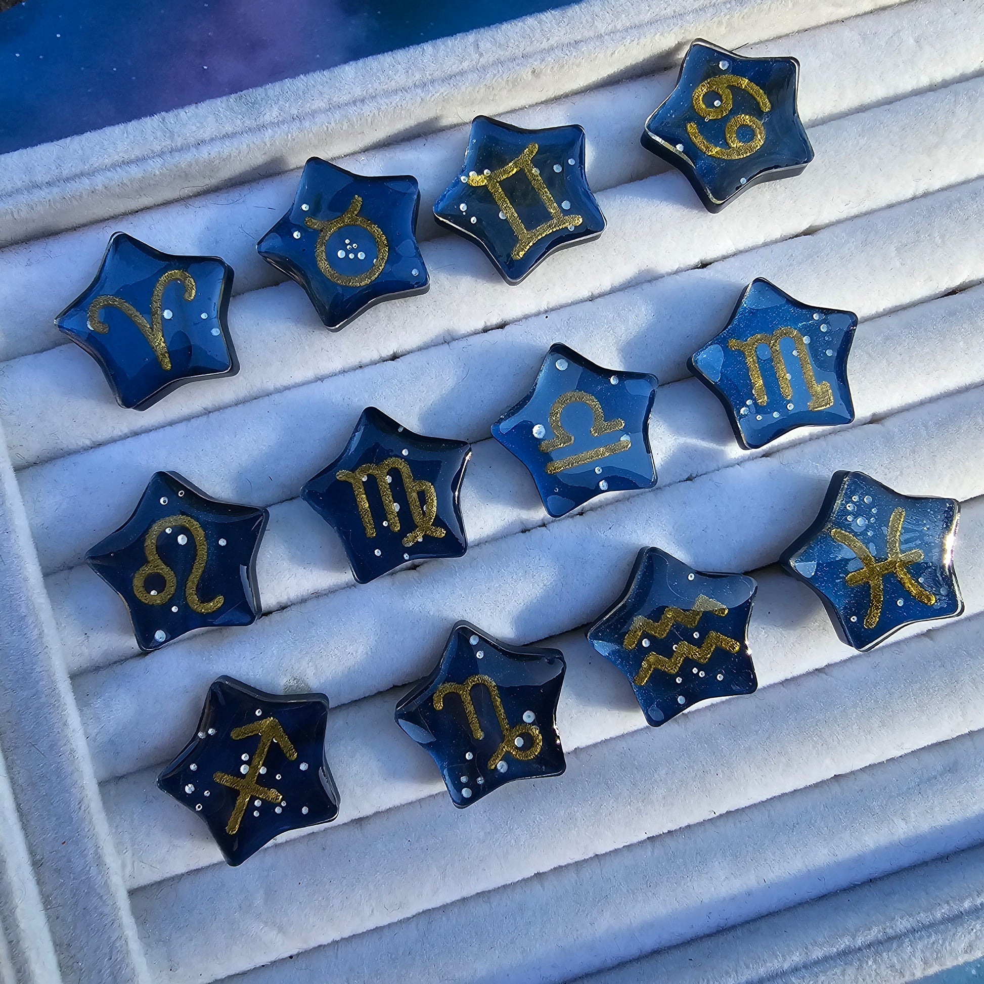A gorgeous marble purple or blue star with hand painted constellation stars and the matching gold zodiac symbol.