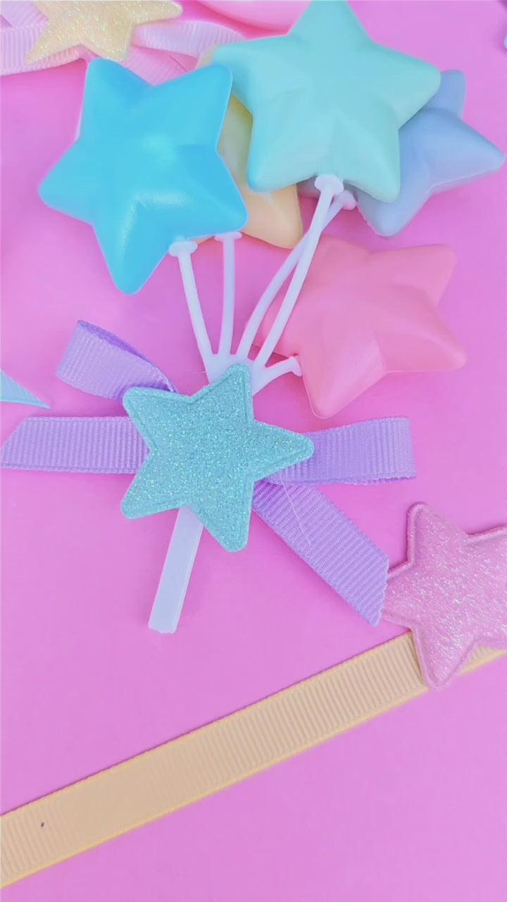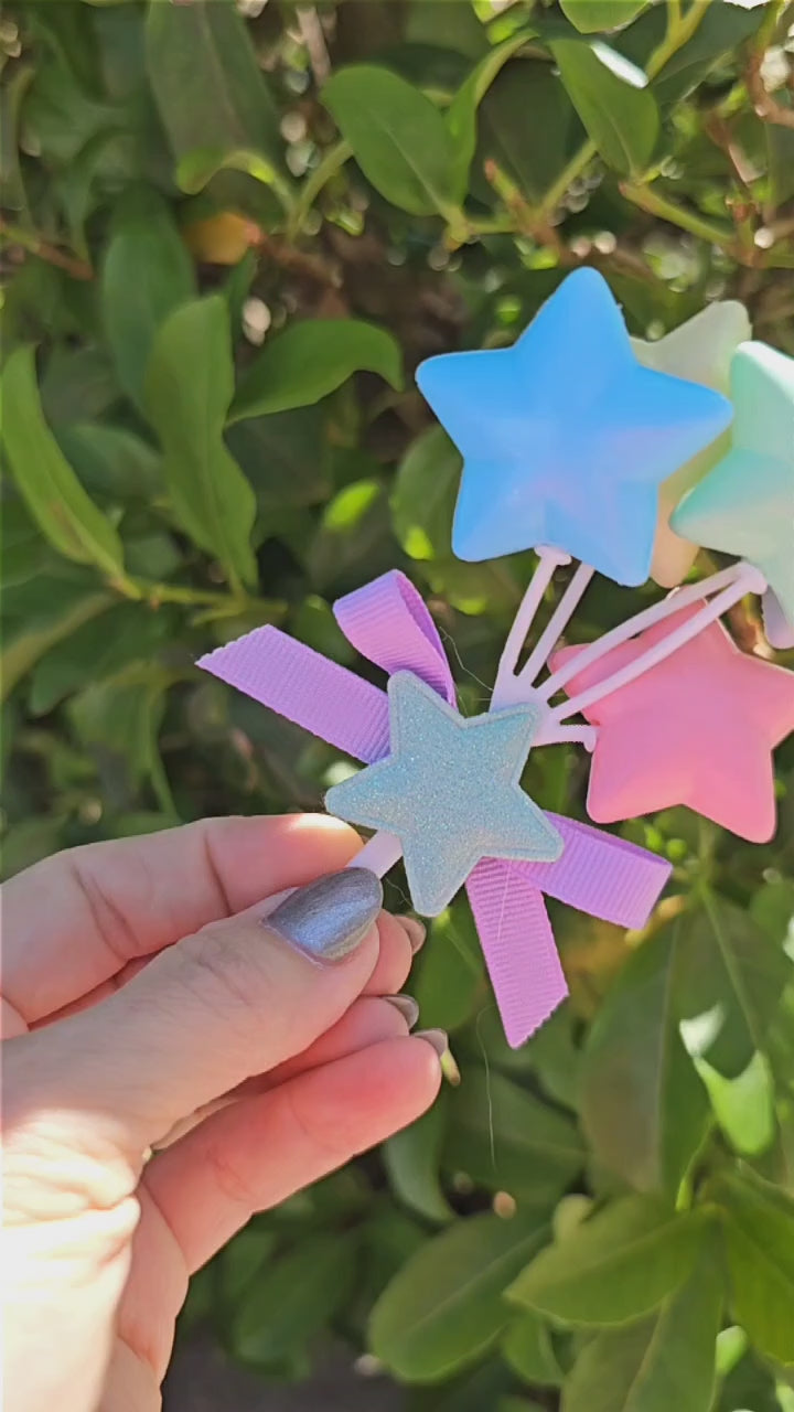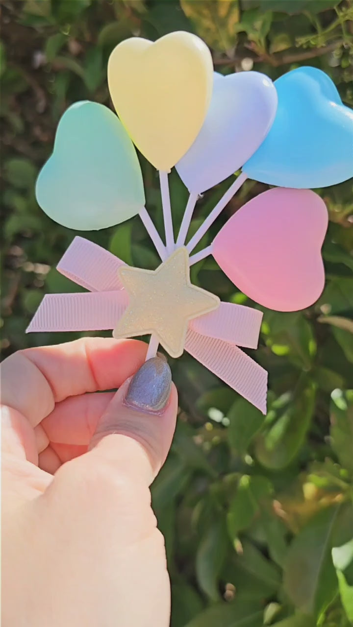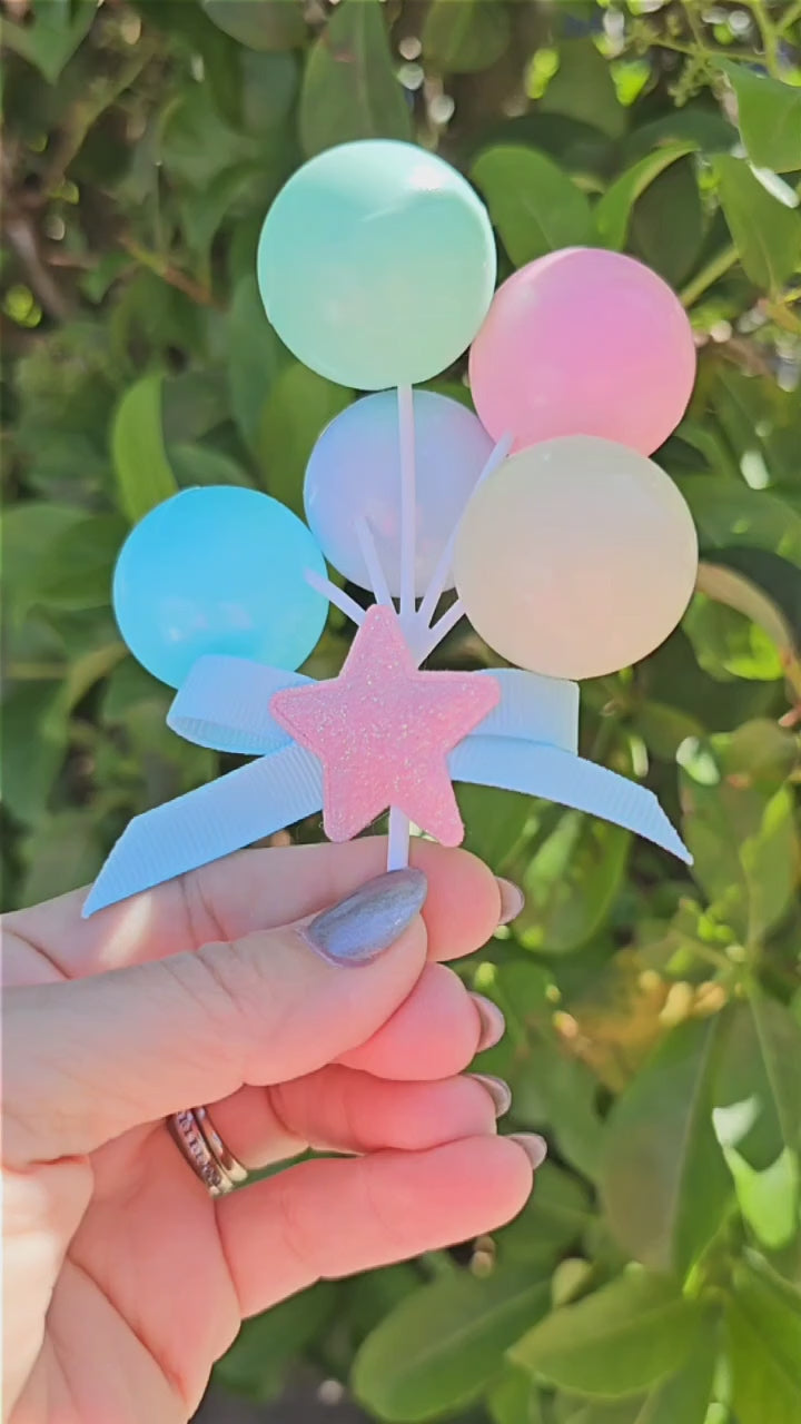 A bundle of five pastel colored balloons made into a hairclip. Balloons are adorned with a pastel colored bow and a coordinating glittery star.