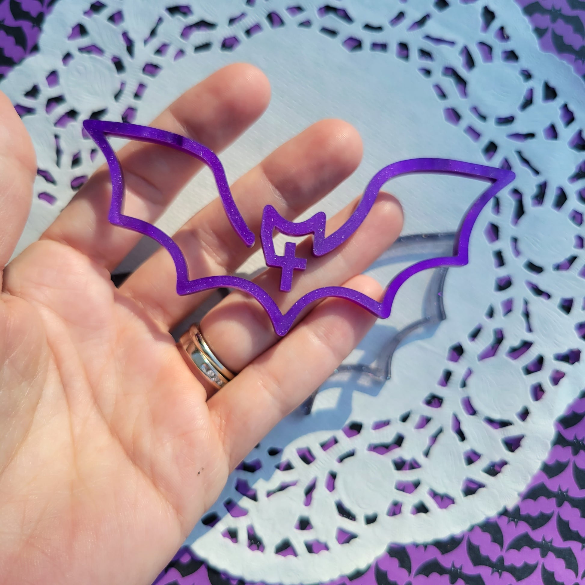Designed and cut out of acrylic. They come in either purple pearl or grey glitter.