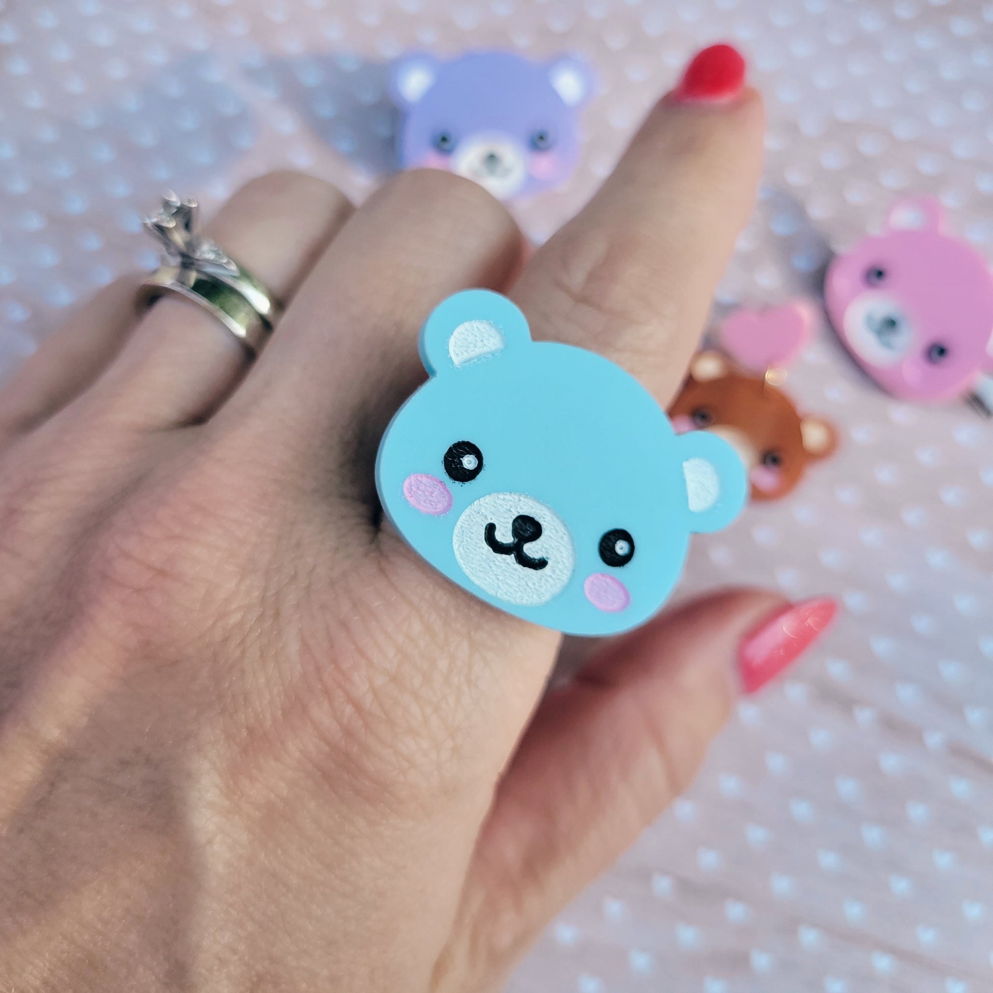 The bears come in pearlized brown, pastel pink, blue or lavender. The ring is stainless steel and adjustable.