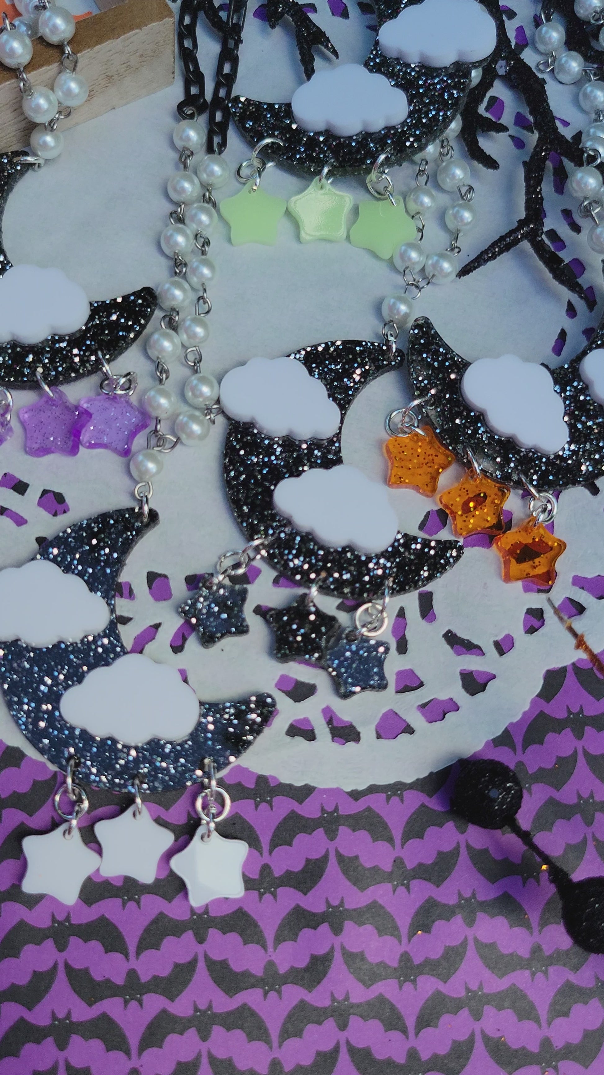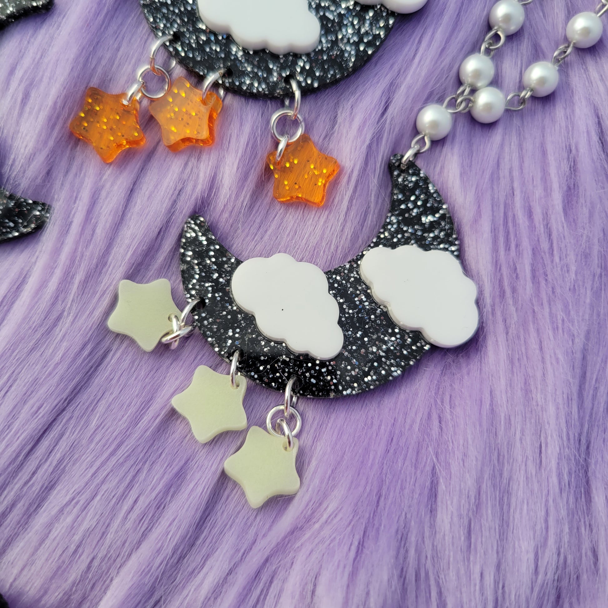 A black sparkly moon pendant with a trio of stars. Stars come in Sparkly Black, White, Glow in the Dark, Glitter Purple and Glitter Orange.
