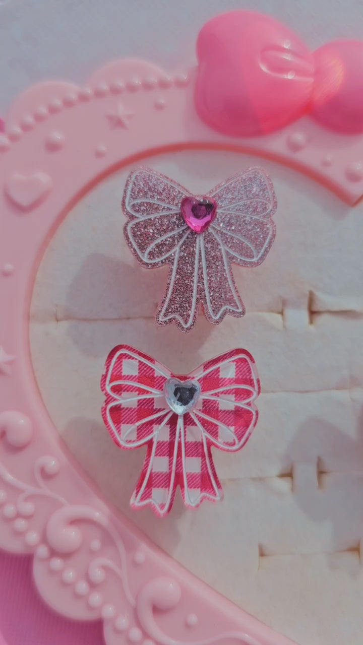 A pink or red hand painted bow adorned with a heart gem secured to an adjustable stainless steel ring.