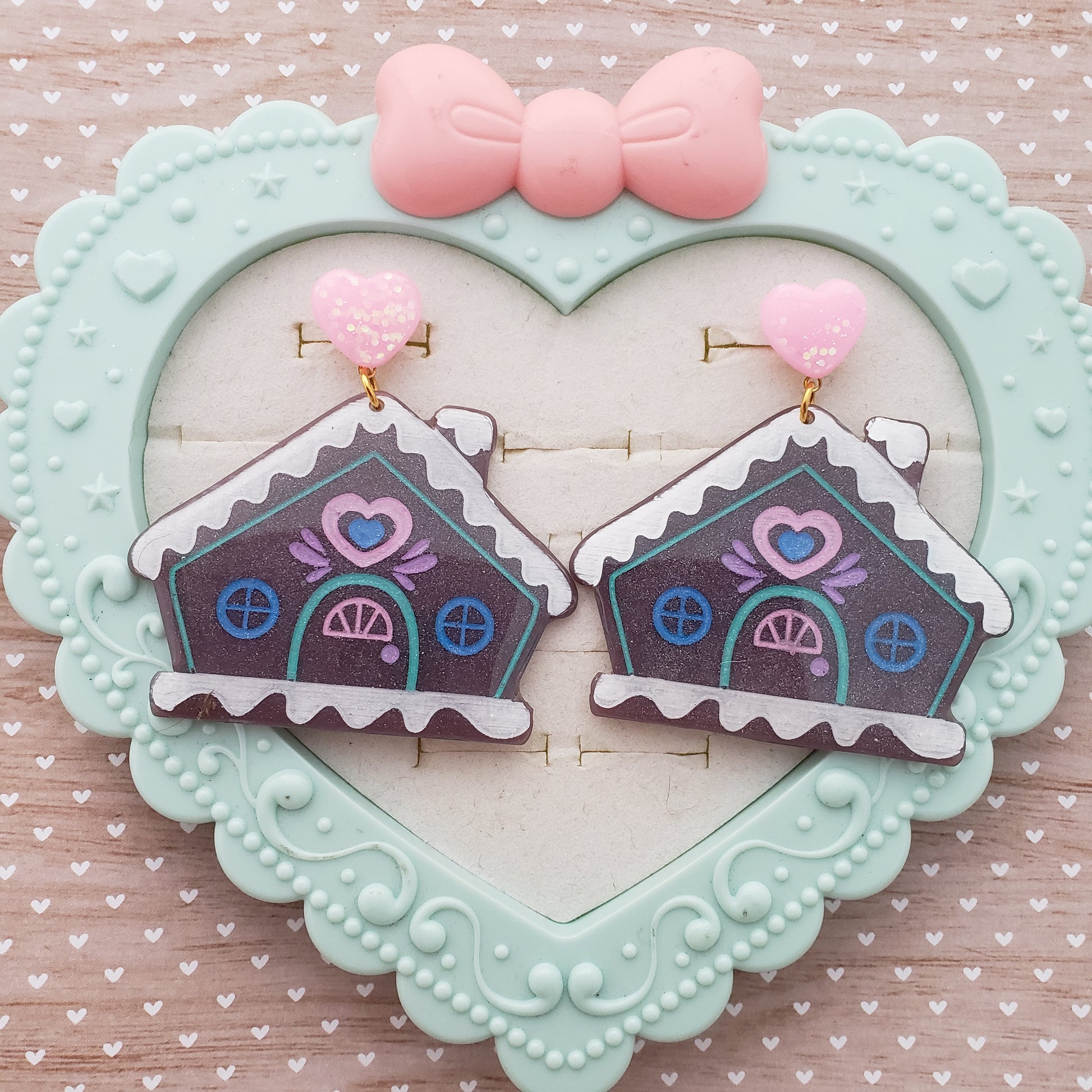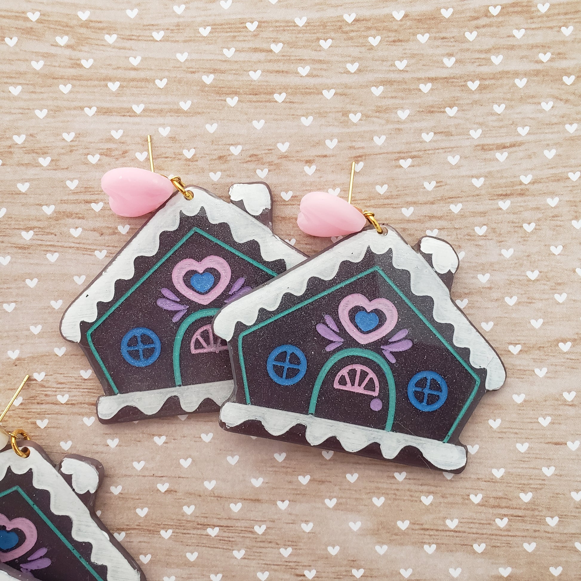 A pair of hand painted resin "gingerbread houses" hanging from a pastel colored heart stud post.