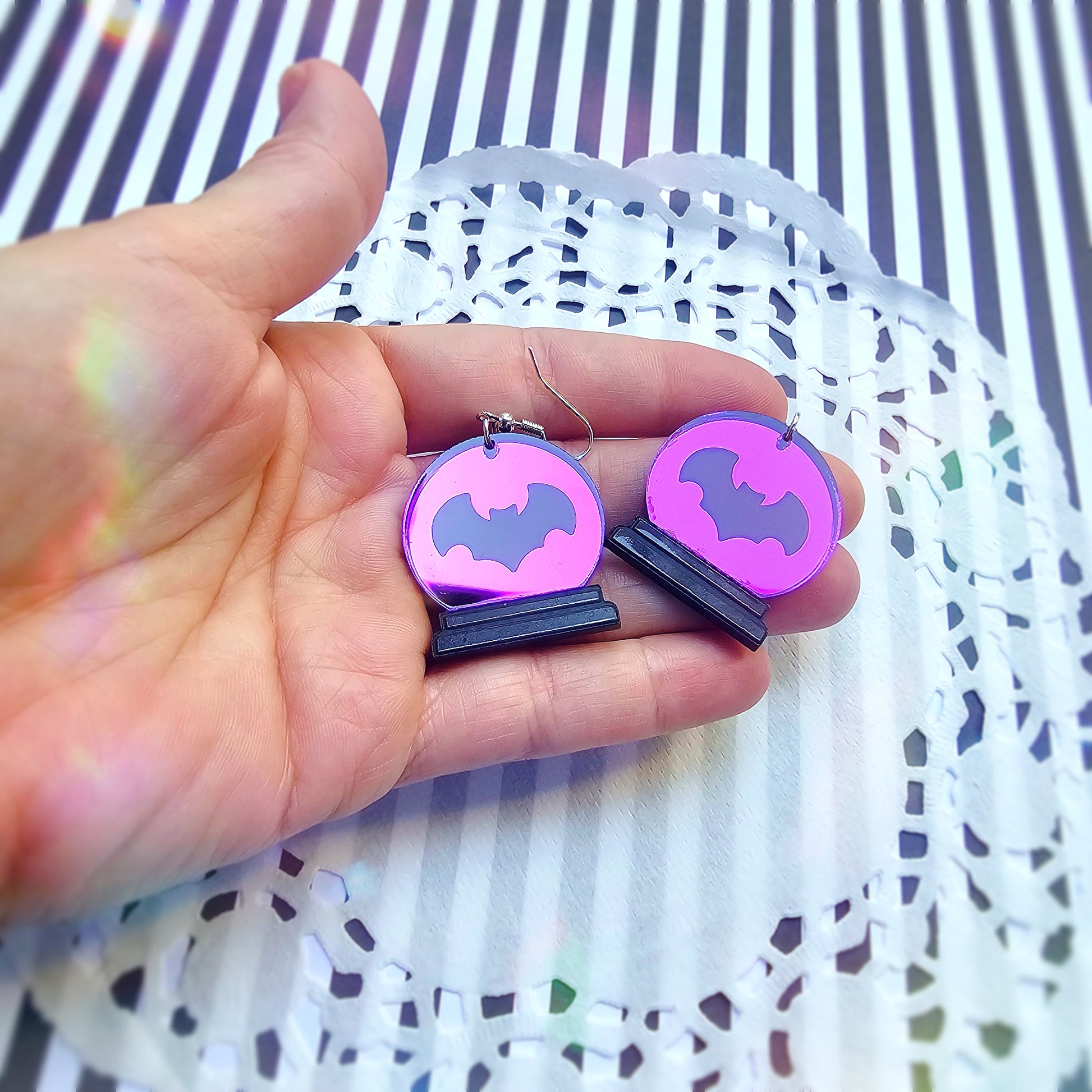 A pair of purple mirrored crystal balls with a bat engraved in the center.