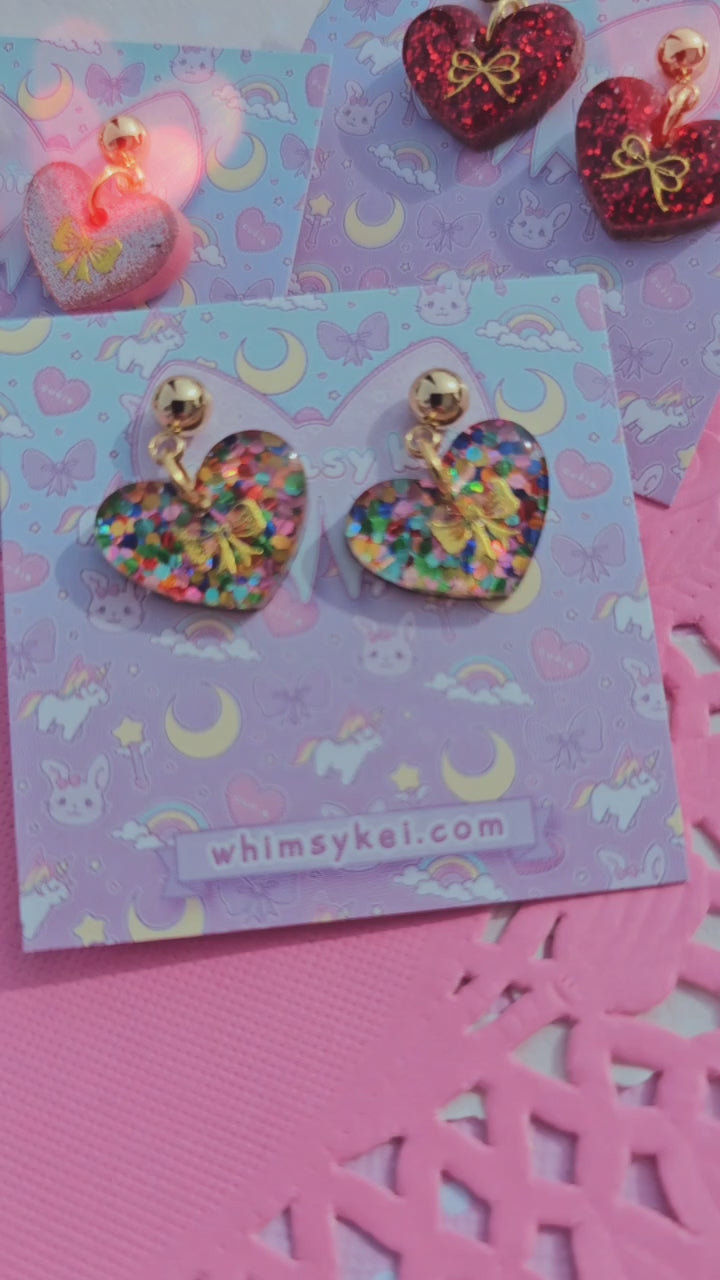 An assortment of dainty hearts with gold bows adorning their center. A gold tone stainless steel post or clip on is the earring.