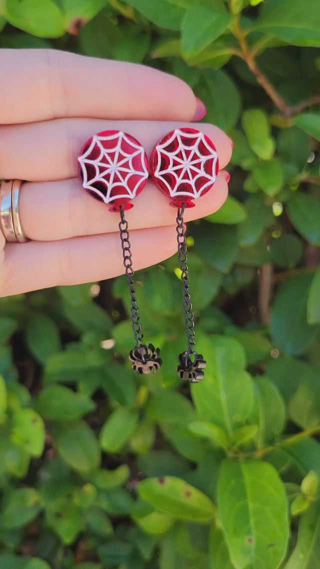 A pair of spooky spiderweb balloons cut from mirror acrylic with a black shiny spider charm hanging from a silver chain "web"