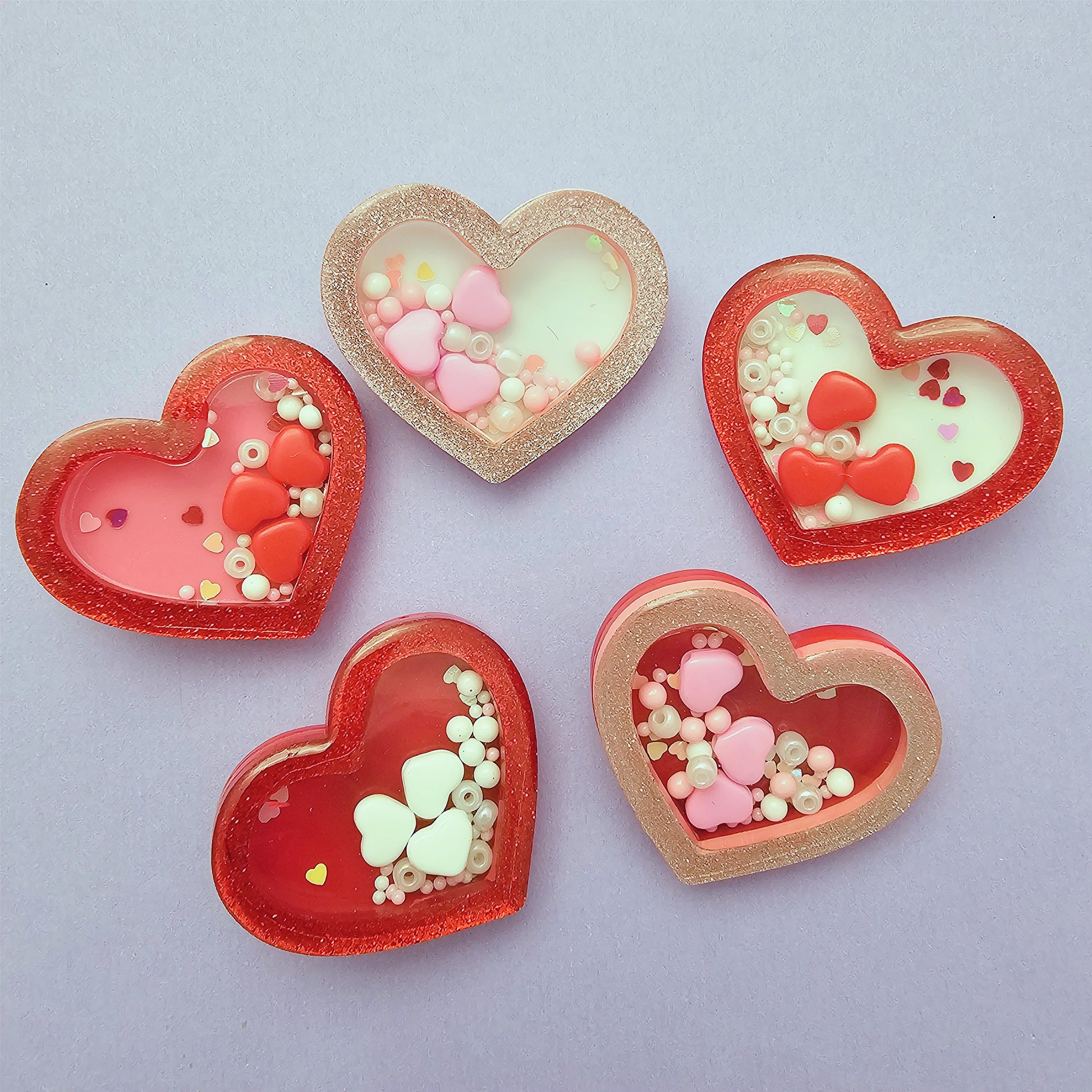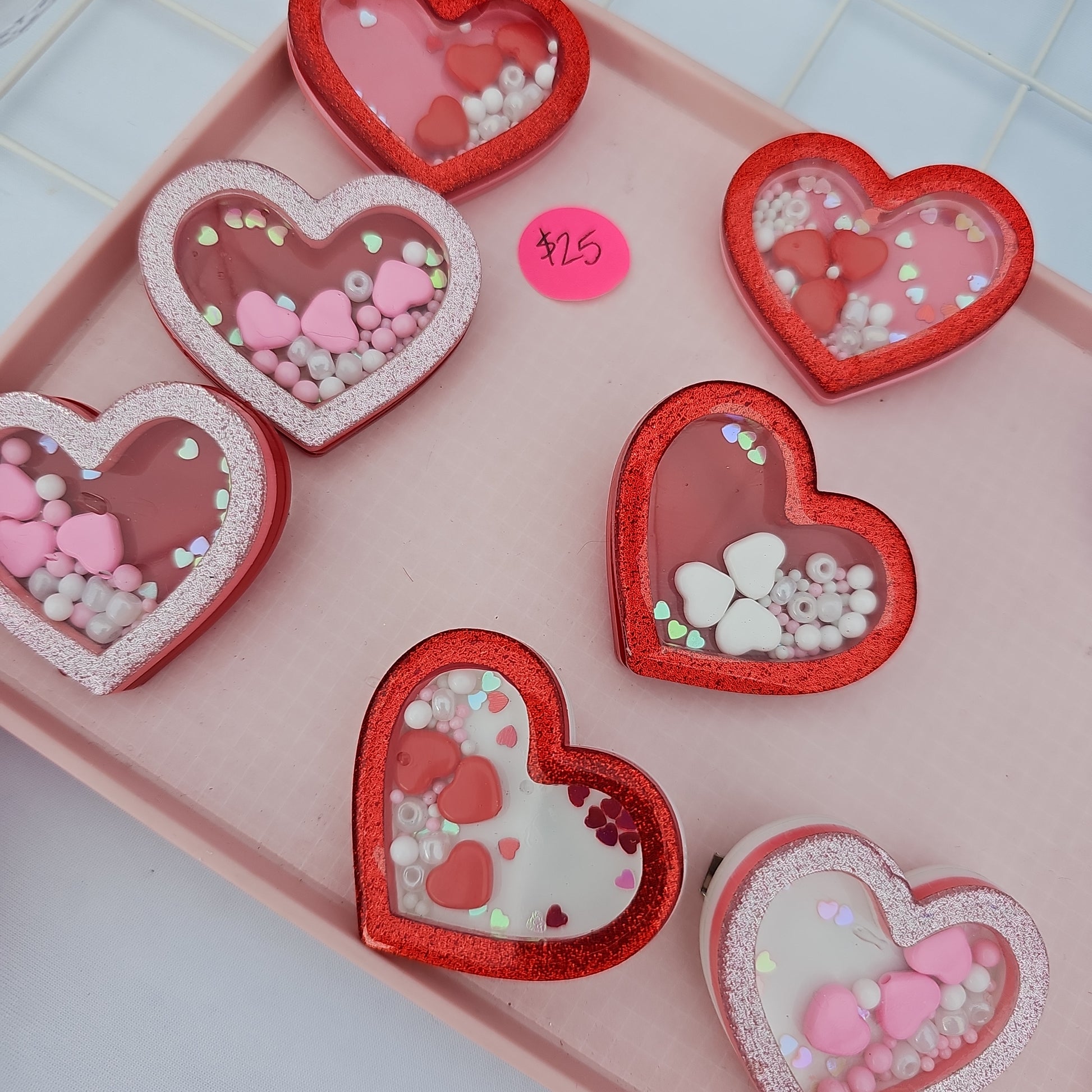 Pink and/or Red Hearts that are filled with beads and baubles that move around when shaken. These sparkly shaker clips are designed, cut and assembled in house by hand!