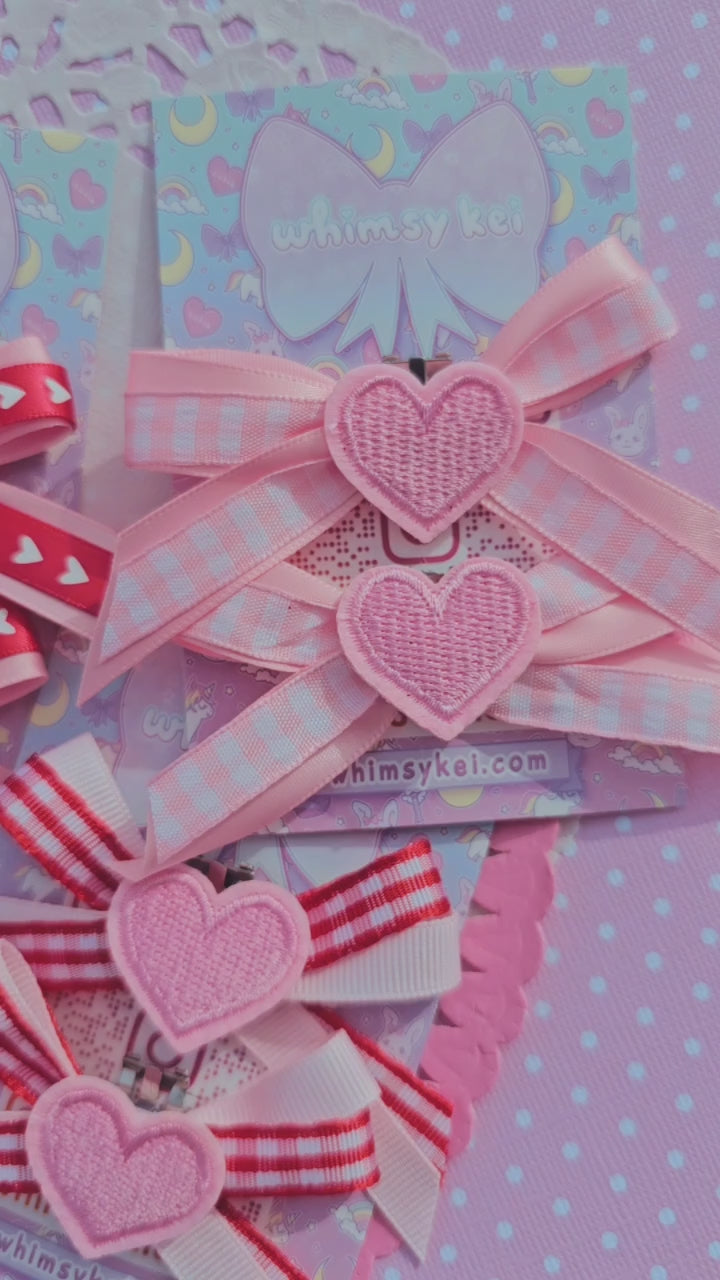 Adorable bow clips with hearts that can be worn anywhere they can be clipped to!