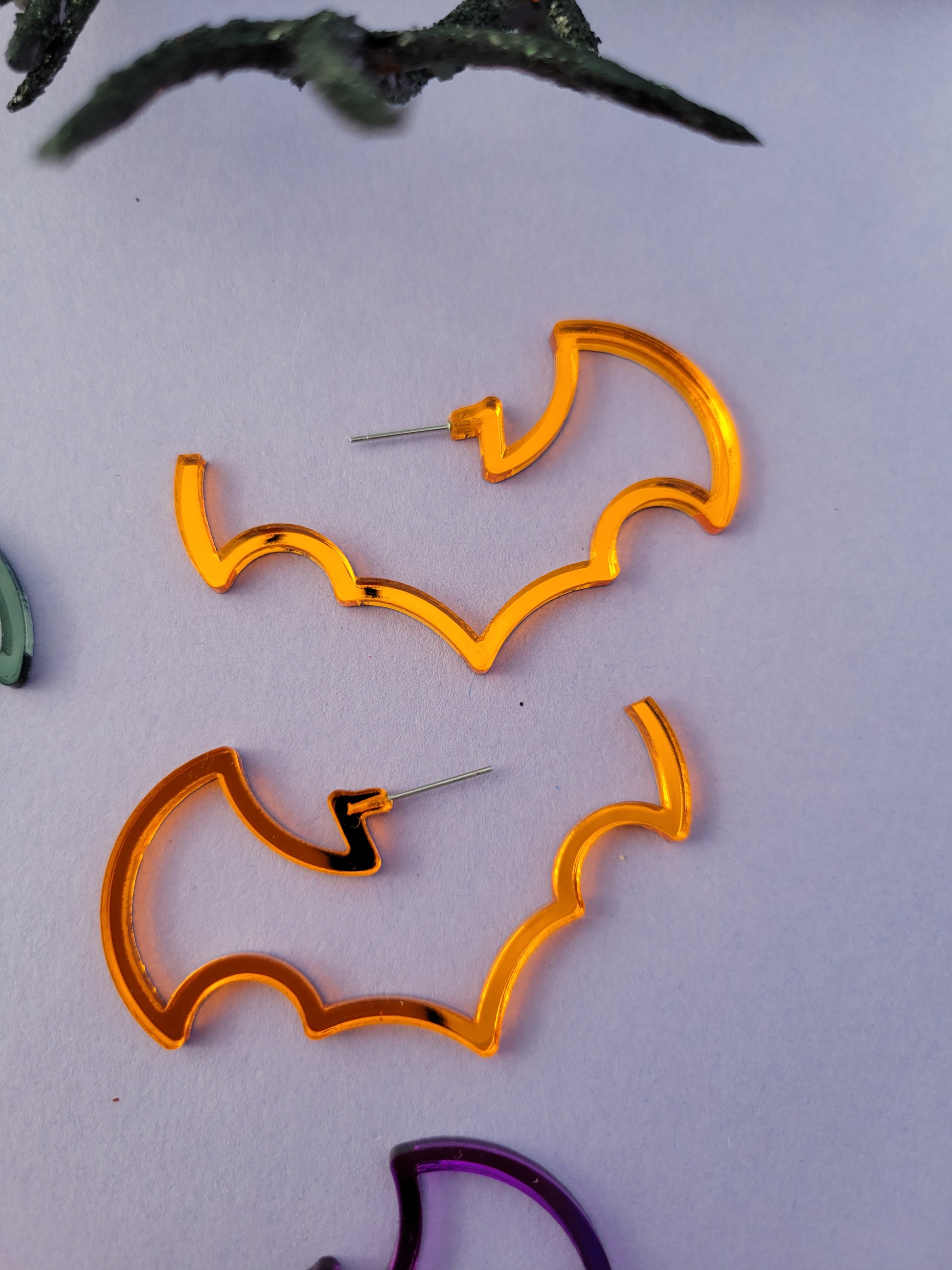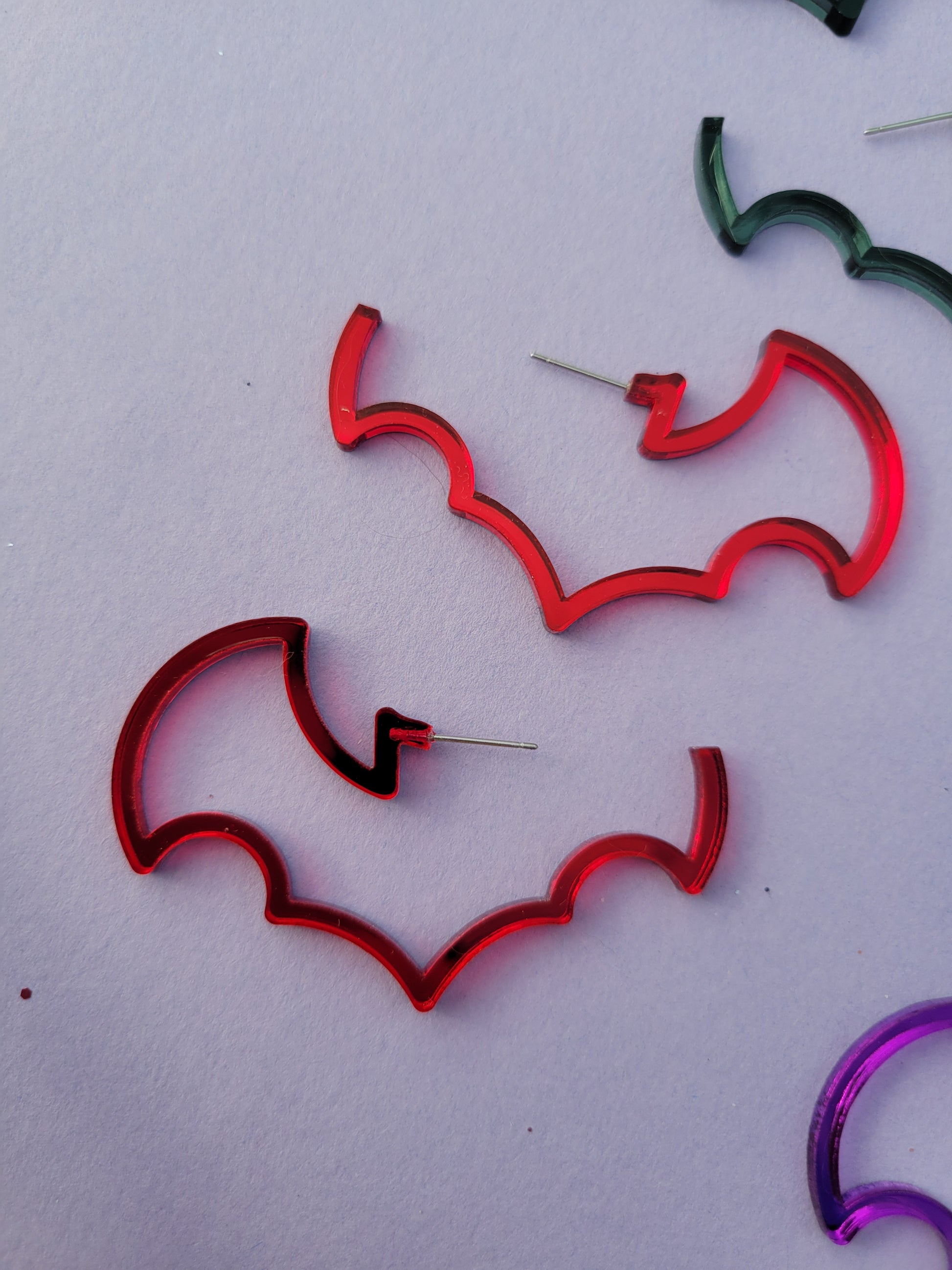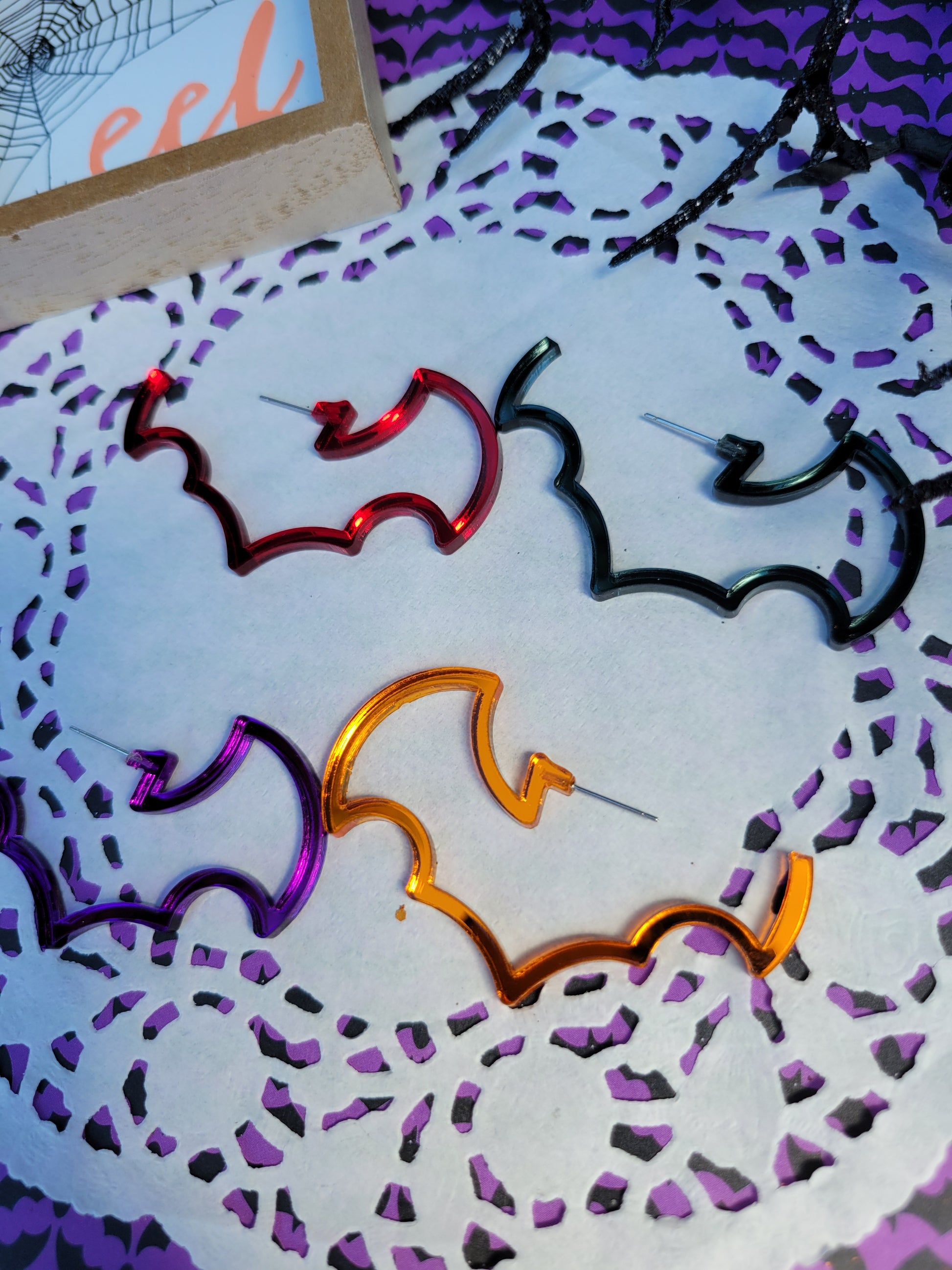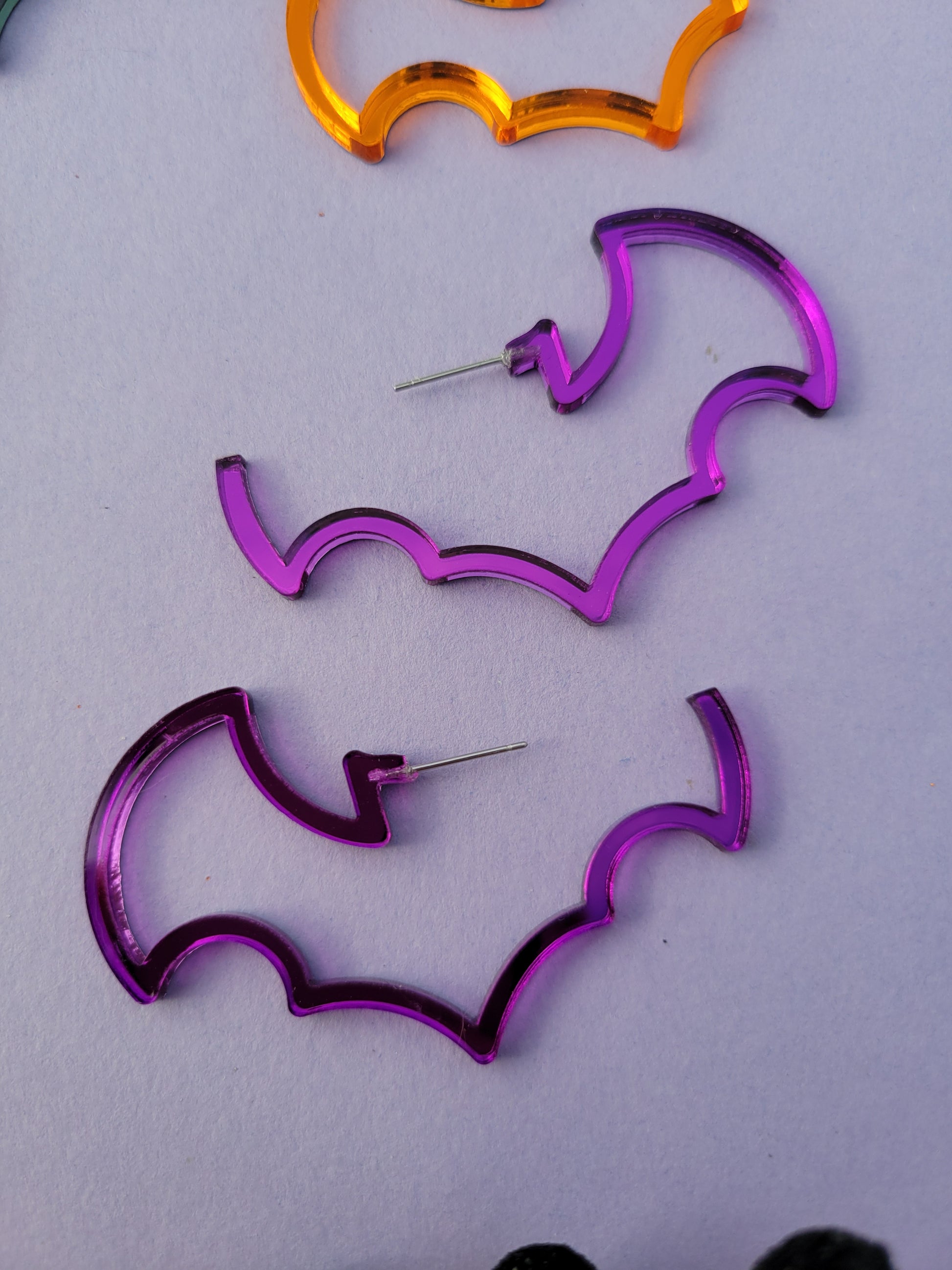 A pair of giant mirrored acrylic bat "hoop" earrings