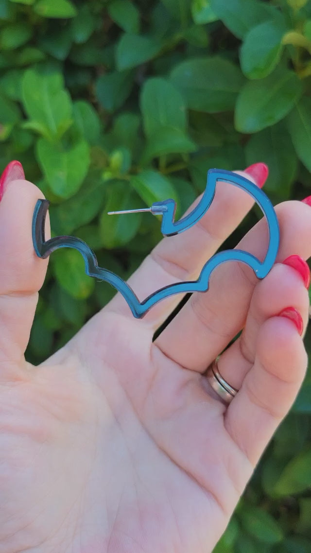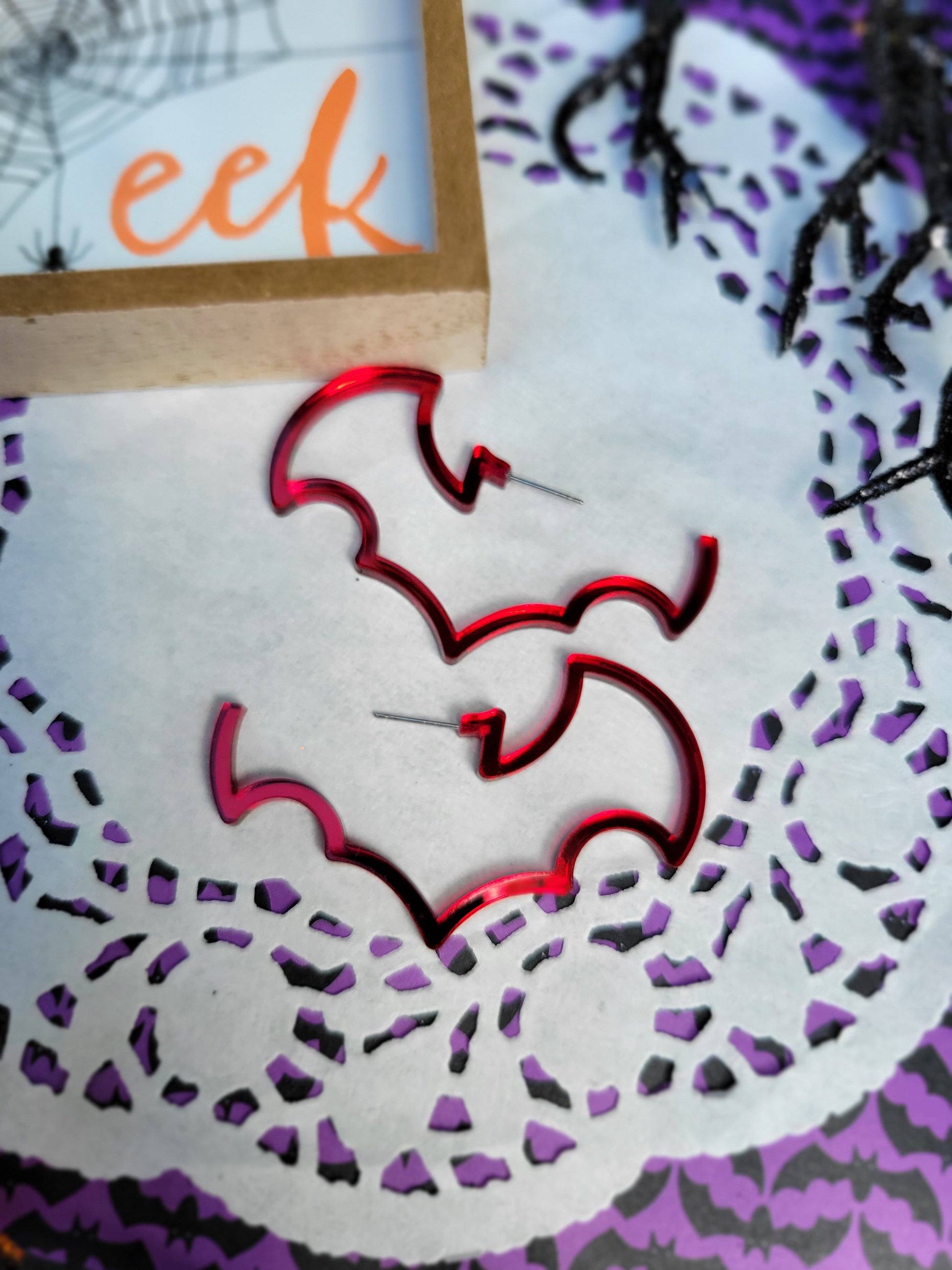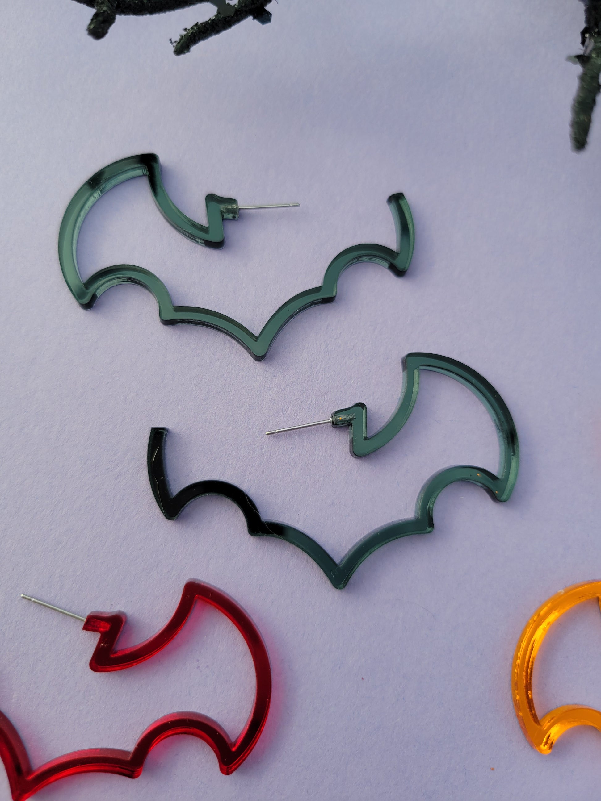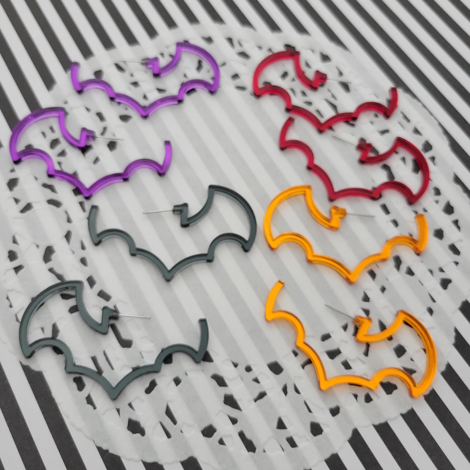 A pair of giant mirrored acrylic bat "hoop" earrings