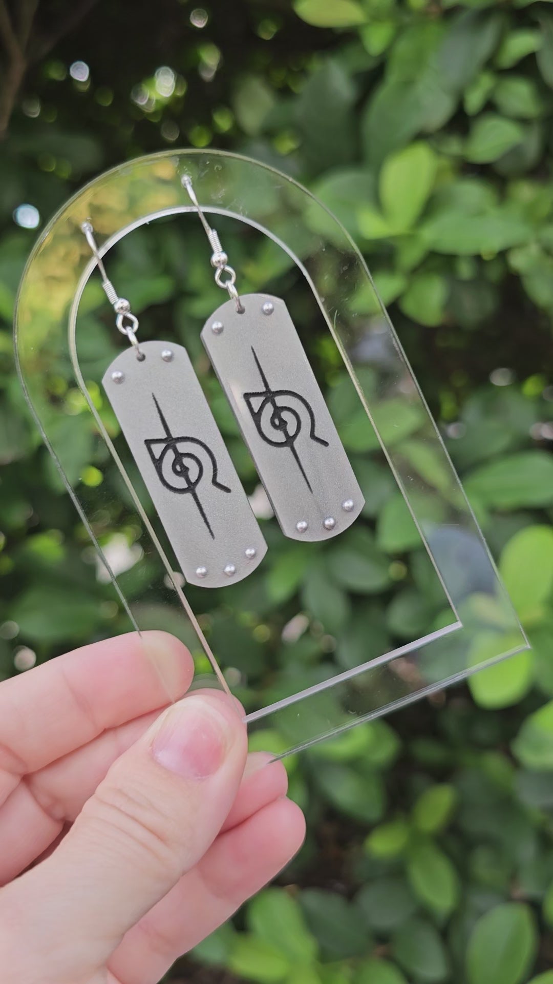 Designed and cut out of acrylic. Each pair is a grey pearl "headband" plate with a village symbol.