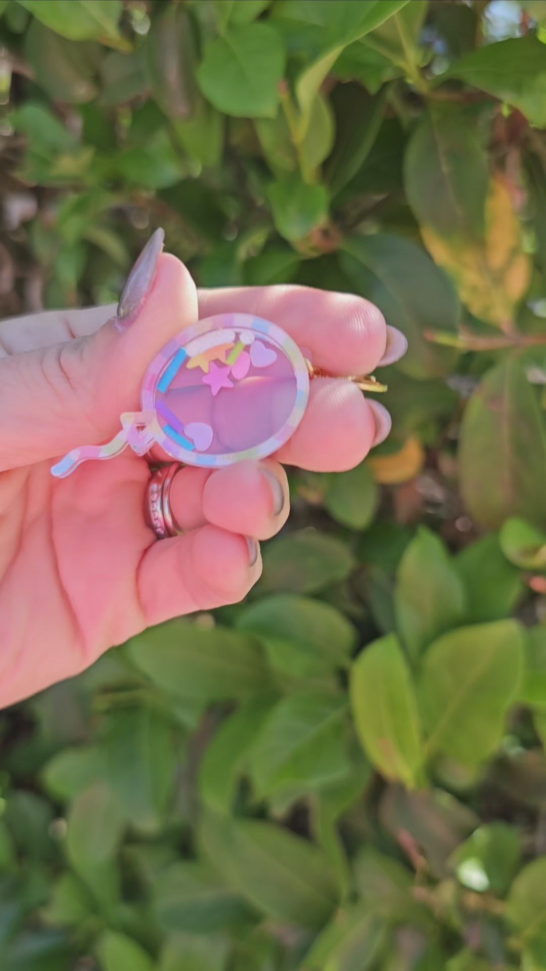 A clear balloon filled with rainbow colored sprinkles inside that bounce around when shaken. The balloon is either outlined in white or rainbow gingham.