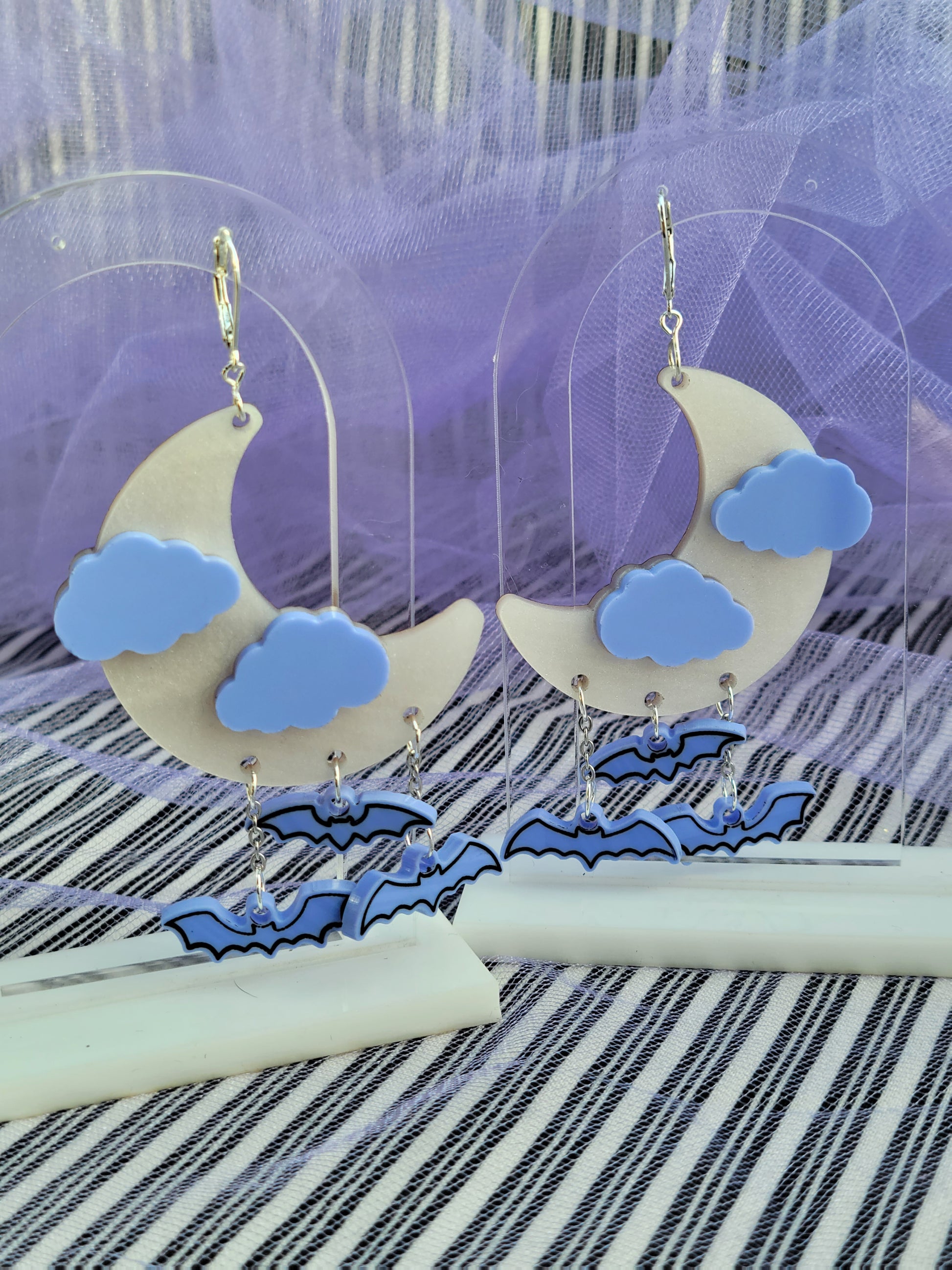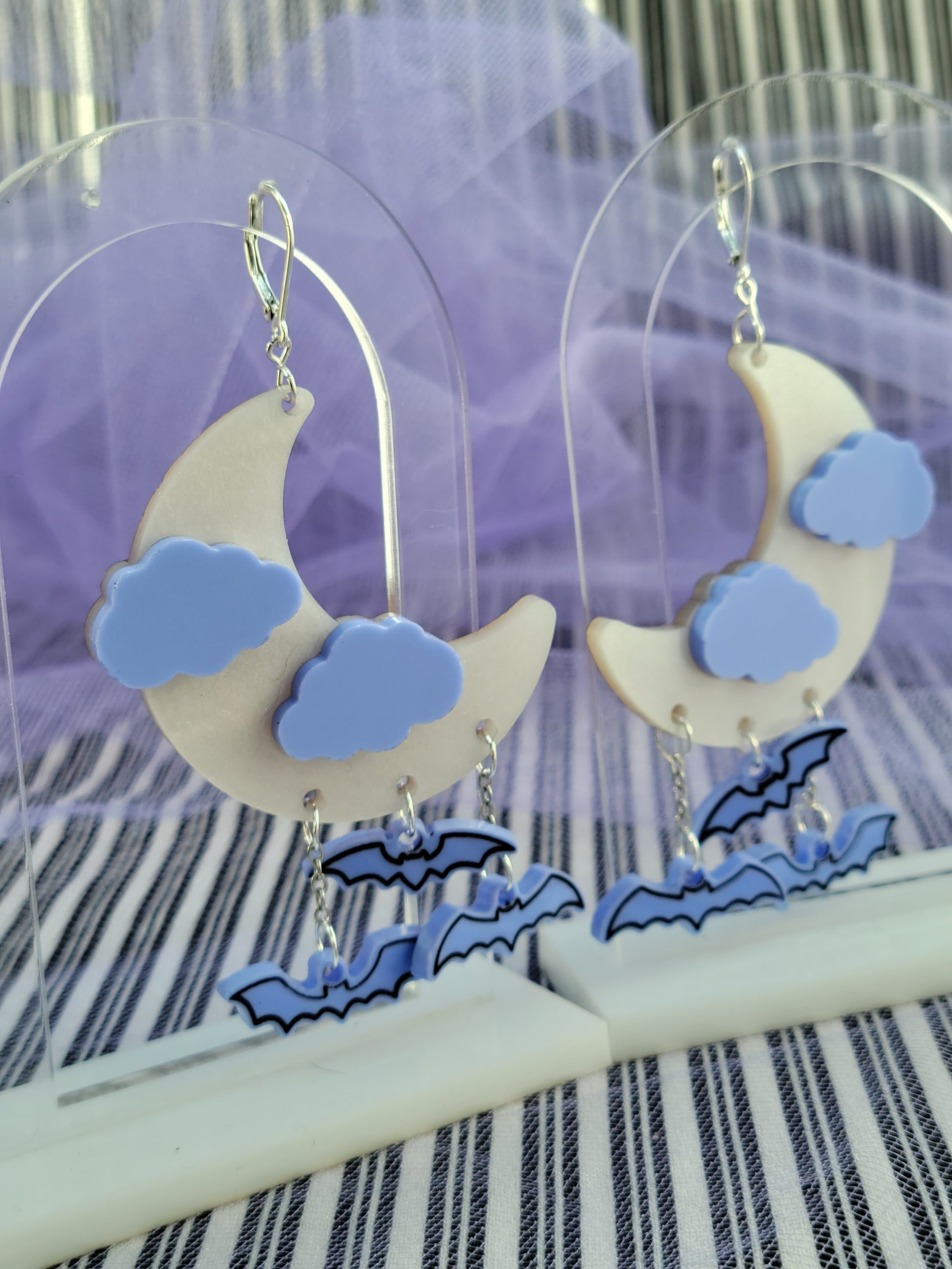 A pair of pearly white moon earrings adorned with matte lavender clouds. A trio of spooky hand painted lavender bats hang from the bottom of the moons.