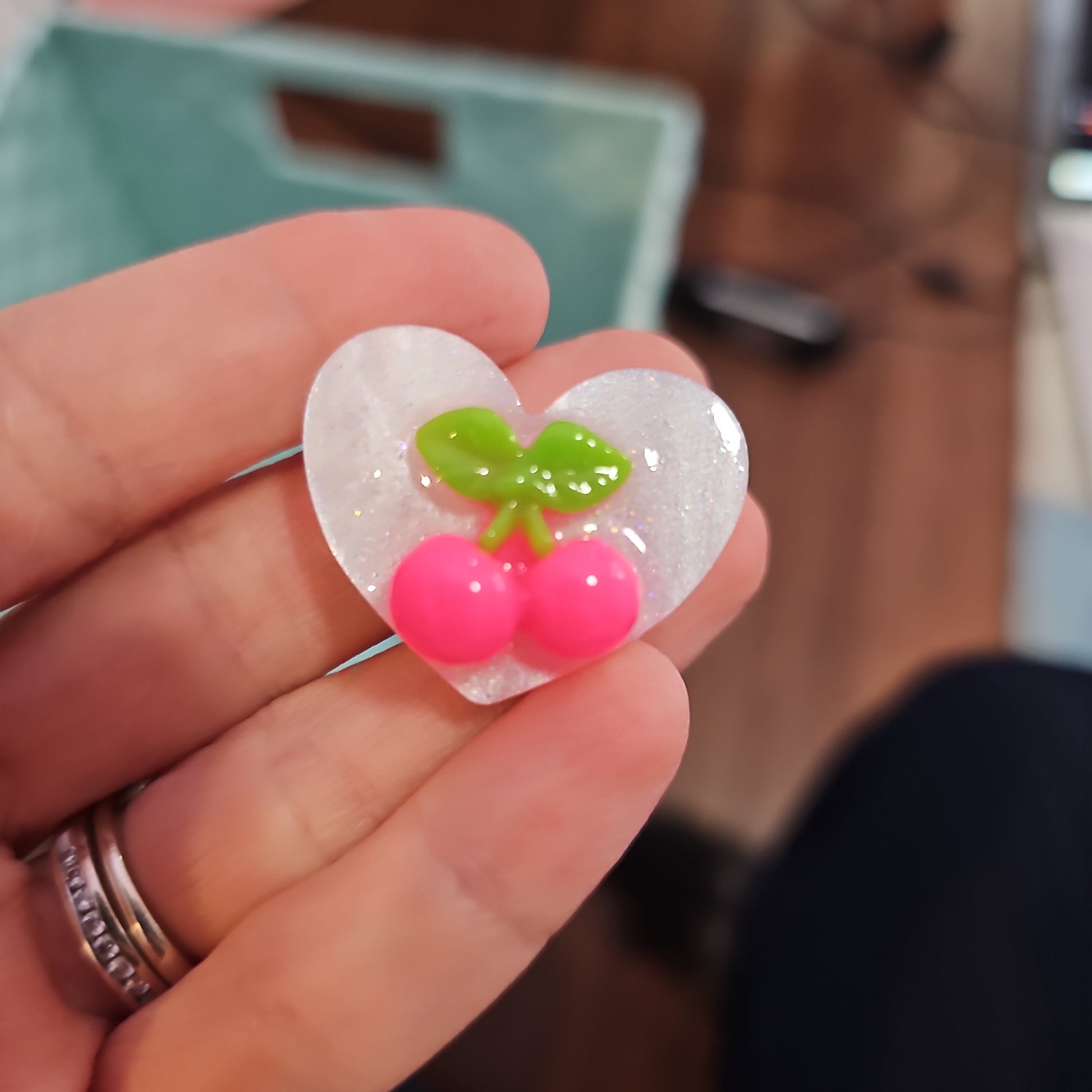 Pastel hearts with miscellaneous cabochons adorned to the top. This listing is for one pin only. The pin back is a post pin with a rubber back.
