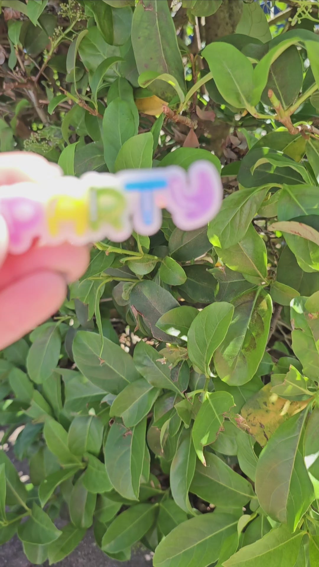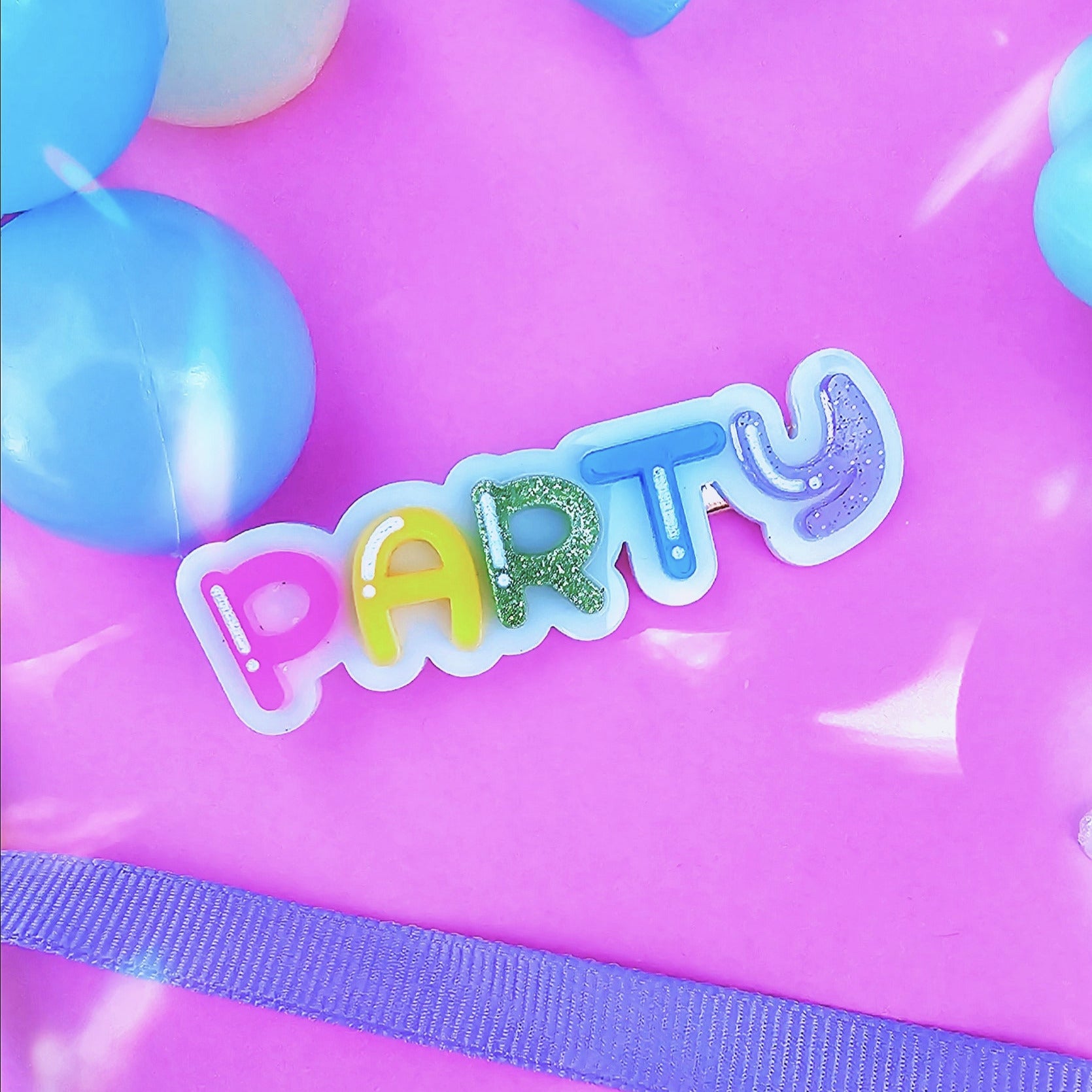 Hair clip is made of a rainbow of letters spelling "PARTY" on a white base.