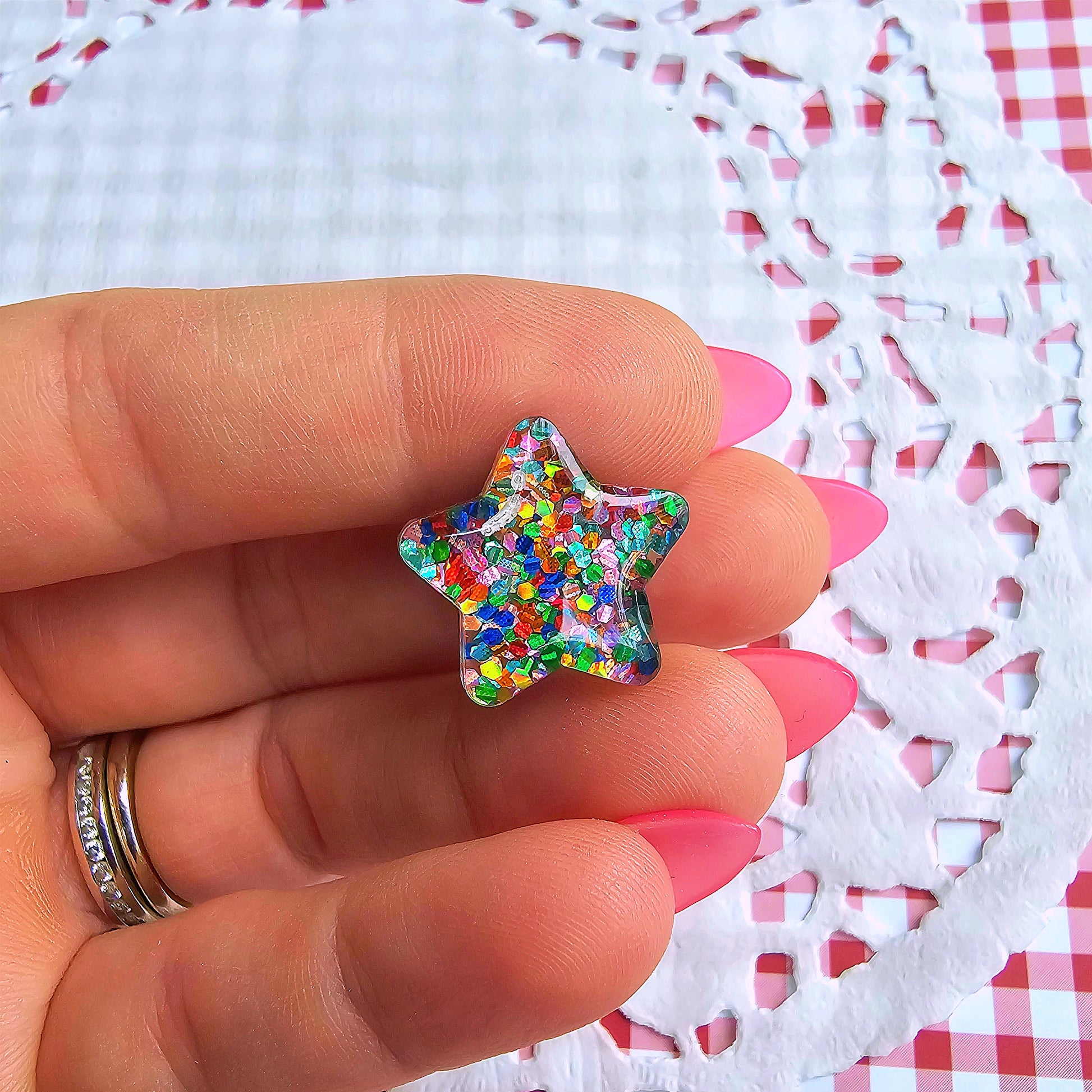 A puffy rainbow star pin. Measures about .75" x .75". Cut out of acrylic and domed in resin.