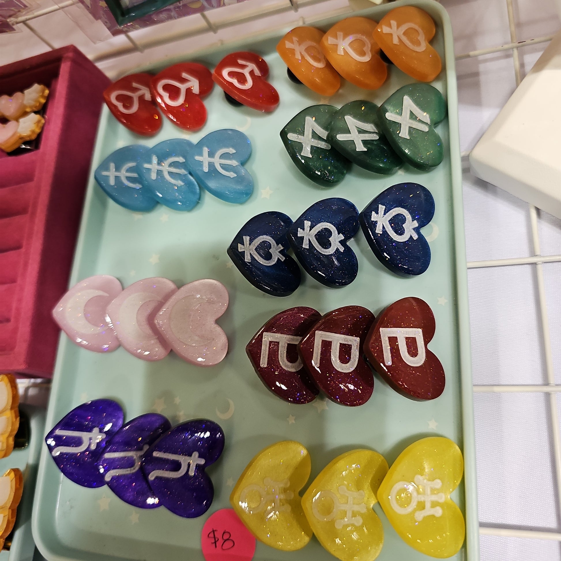 In the name of the moon! A sparkly heart pin engraved with a planetary symbol corresponding to the sailor scout.
