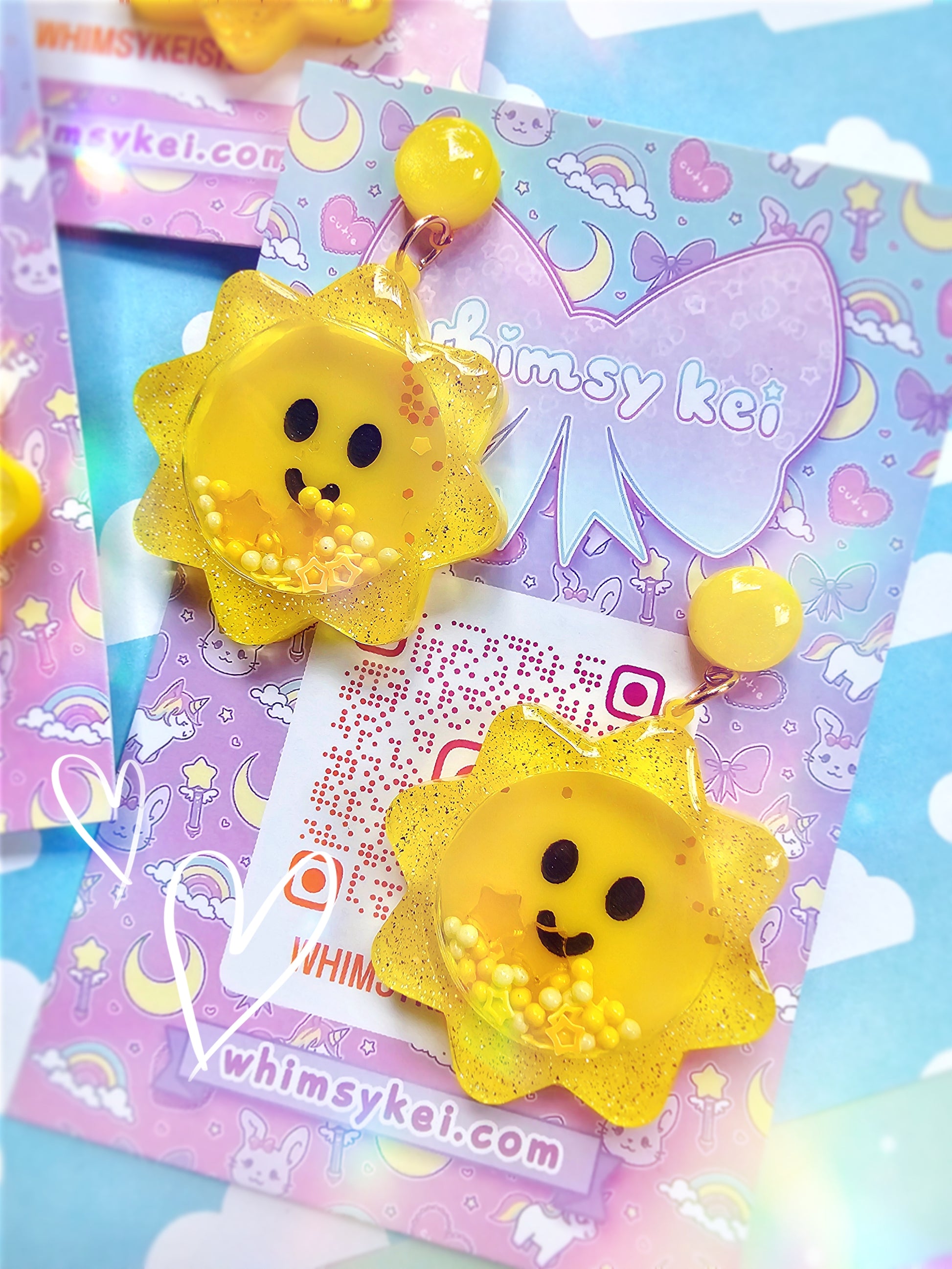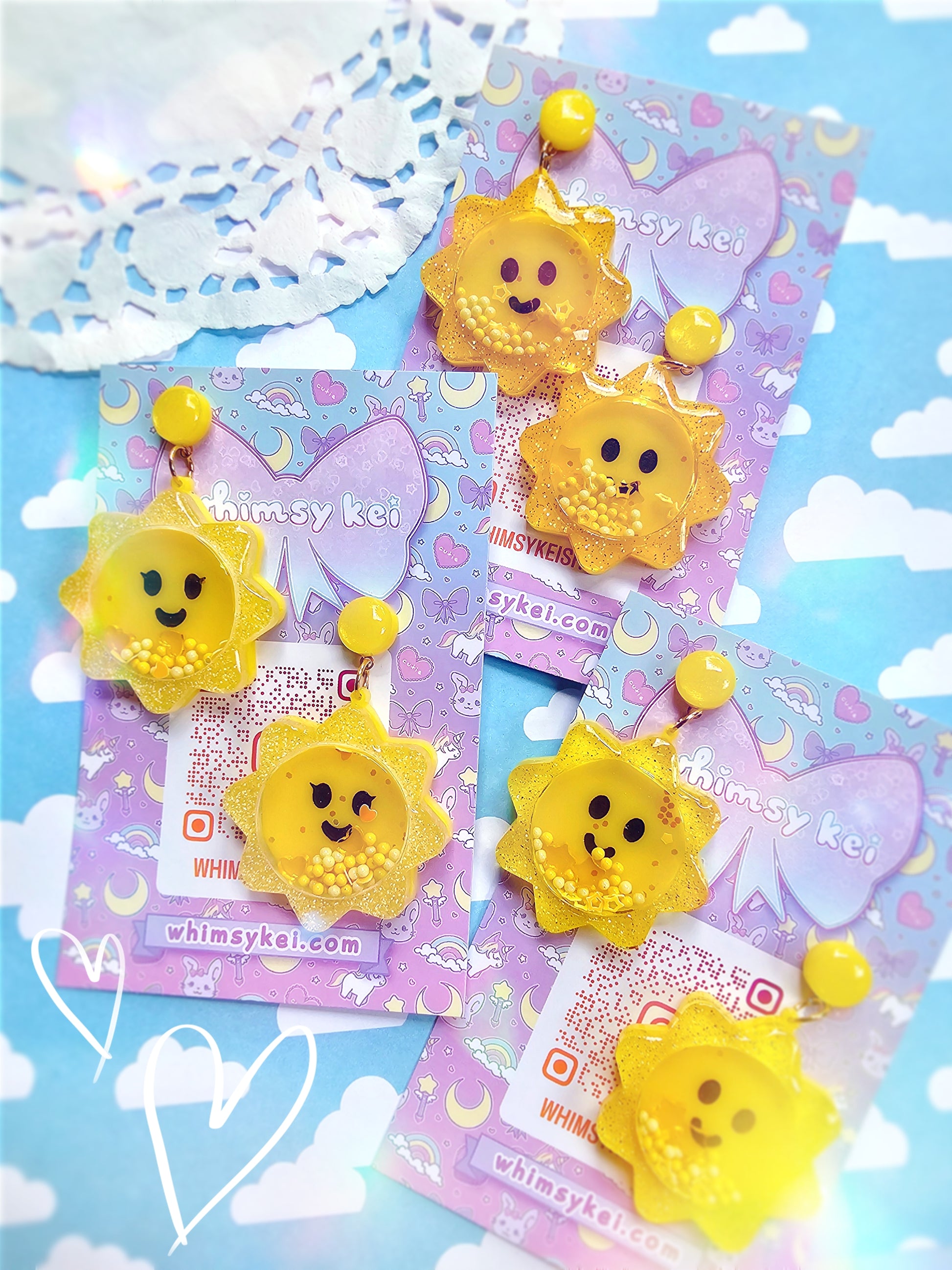 A pair of pastel yellow suns hanging from pastel yellow studs. The stud is a stainless steel post. The suns have a kawaii hand painted face on the sun and are filled with yellow baubles.