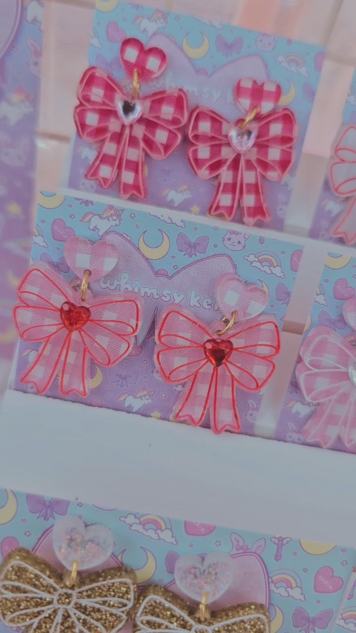 A pair of hand painted acrylic bow earrings hanging from a color coordinating heart stud and adorned with a heart gem.